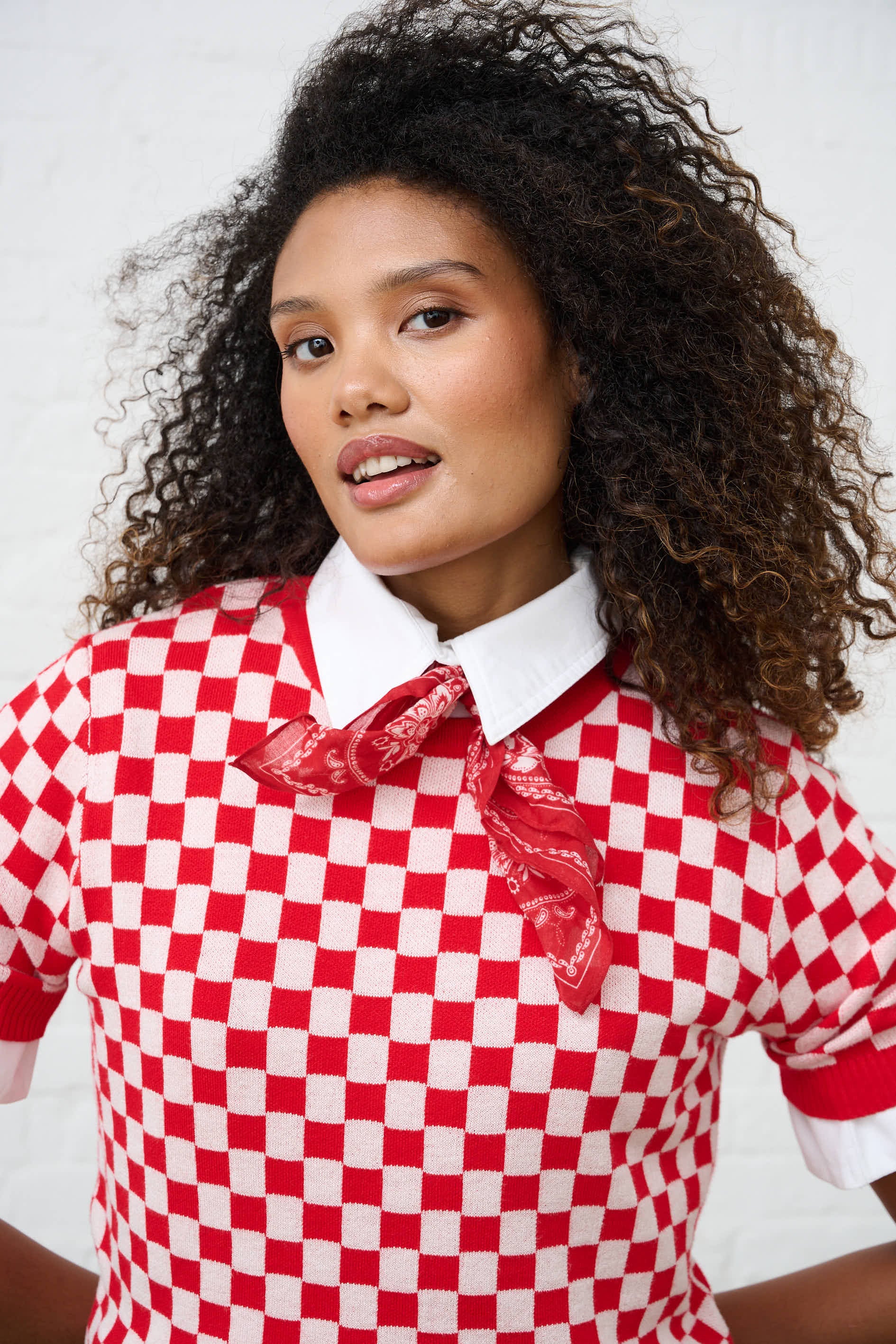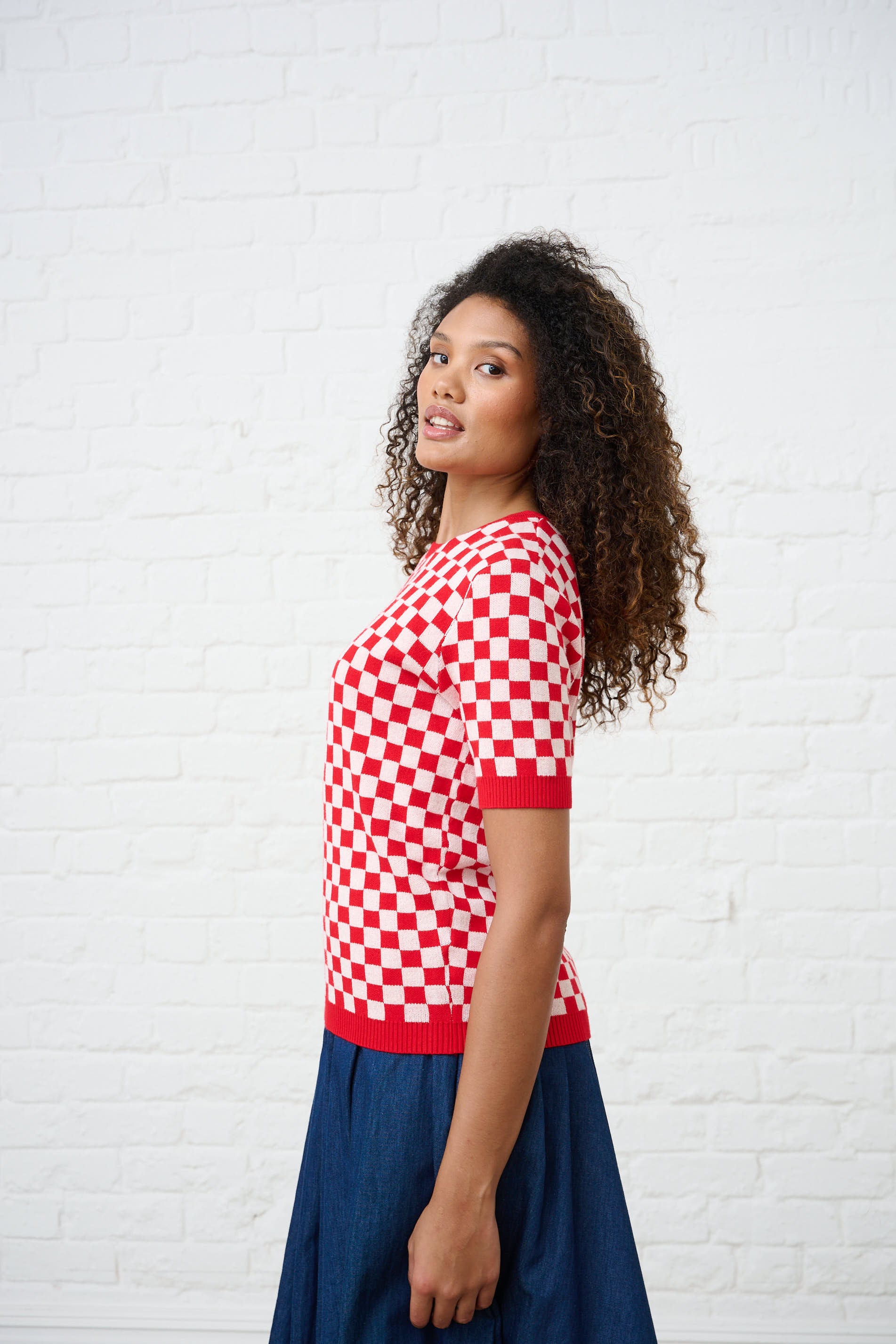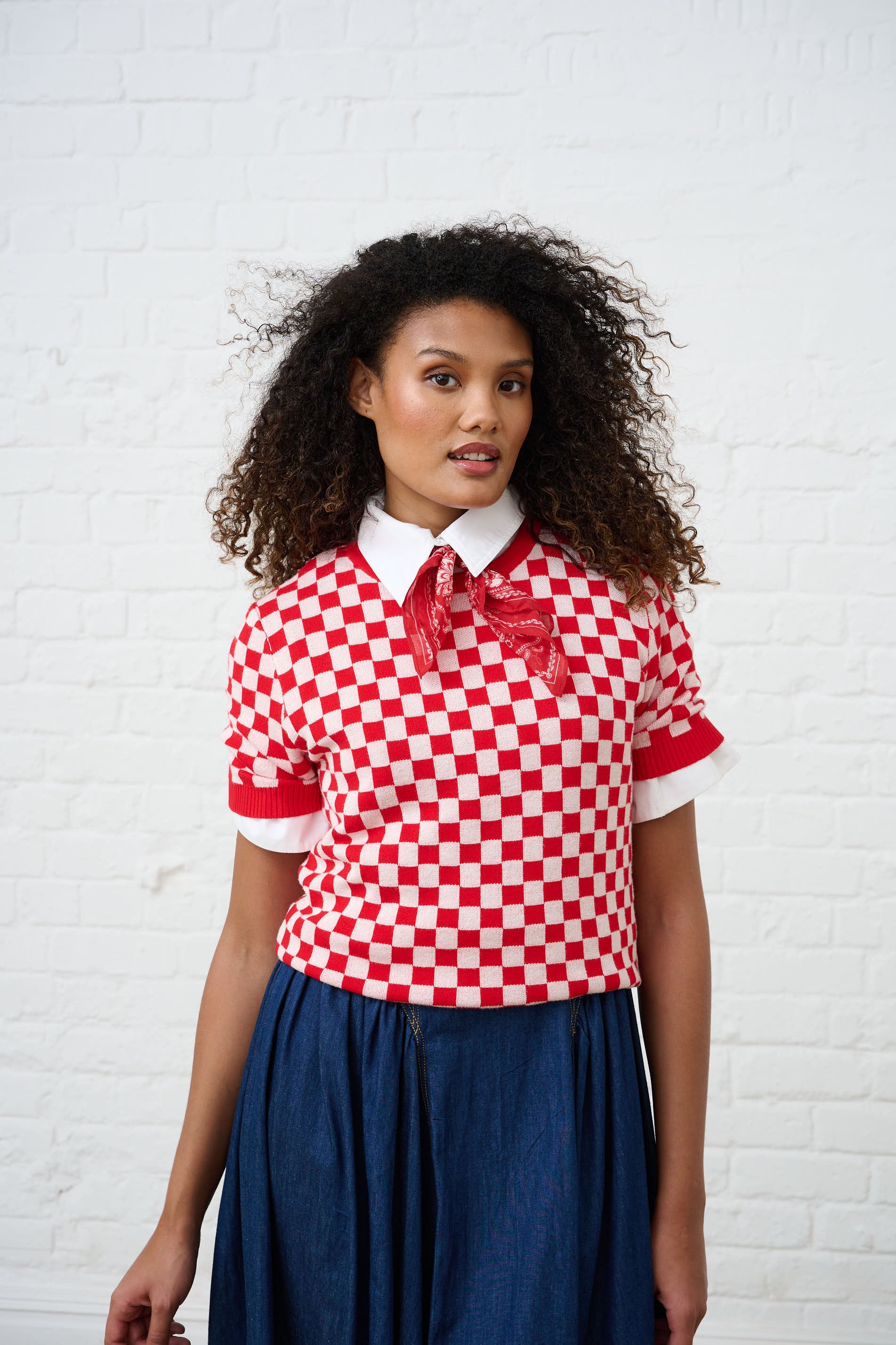 Knitwear Top in Cherry Red Check